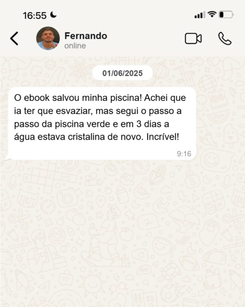 Este guia te entrega o cronograma semanal rápido e fácil de um profissional para você nunca mais sofrer com água verde ou turva. Aprenda a proteger o investimento na sua piscina de fibra contra manchas e danos, economize tempo e dinheiro com um método eficiente e ganhe a total confiança para ter uma água cristalina o ano inteiro, sem depender de ninguém.